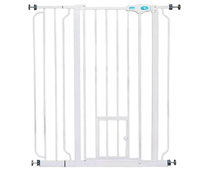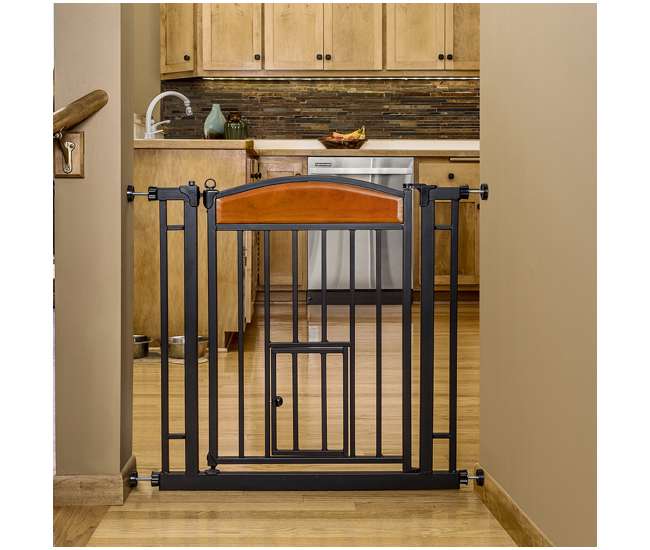 Hardware Package Expandable Swing Gate. Hands Free Pet Gate Hands-Free Operation Optional Easy Lock Handle Fits openings 30-44 wide Pressure mount system makes set-up quick and easy Al. The pet door is of the size 10 by 7 inches.